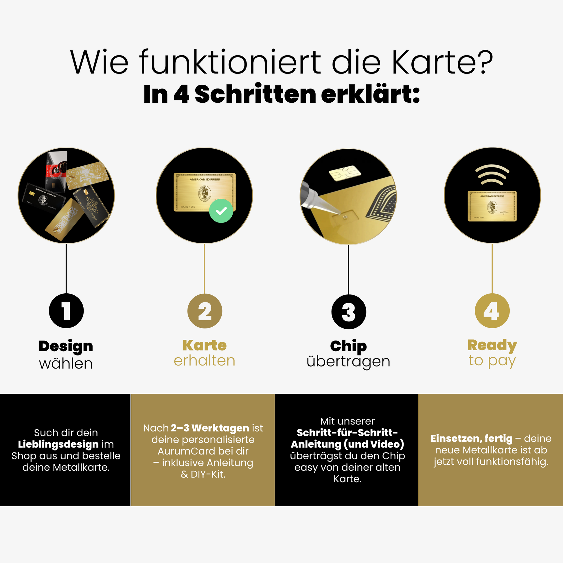 Zu jeder Bestellung bekommst du unser Chip-Übertragungs-Kit mitgeliefert – inklusive Spezialkleber. Damit du deine neue AurumCard easy selbst aktivieren kannst – ganz ohne Extra-Kosten.